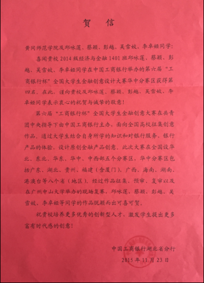 在2015年11月17日的第六届“工商银行杯”全国大学生金融创意大赛中,我校资源а√天堂中文中文在线学生邱咏莲、吴雪姣、彭越、李卓娅、蔡颖组成的代表队晋级全国十强,获得工商银行各大网点实习就业机会。工商银行湖北省分行特此委托工商银行黄冈分行行长将贺信送到我校招生与就业处,向我校以及获奖学生表达诚挚祝贺,并为获奖团队颁发了1500元奖金及奖品,以资鼓励。