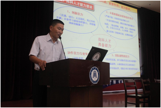 开学典礼上,李月华书记首先致辞,对500余名新同学的到来表示热烈欢迎,并希望新同学在严格遵守校级校规的条件下学会利用当前优越的环境,创造性地学习和开展各项活动,努力学会学习、做人、交流与合作,领悟青春的真谛,并不断提高自己各方面能力。最后,刘汉成院长作了主题为《当代大学生要学会做人做事》的报告,主要从商科介绍(商科背景、商科内涵、重要背景、能力要求),人才培养(学院简介、条件建设、社会实践、学科竞赛、文体活动、学生去向),建议与忠告(“做人做事”践行十个三、力戒十个三)等方面阐述,并要求同学们要立足商科、珍惜时光,志存高远、怀抱梦想,刻苦学习、勇于实践,低调做人、高调做事,争做一个德才兼备、以德为先的高素质的商科人才。