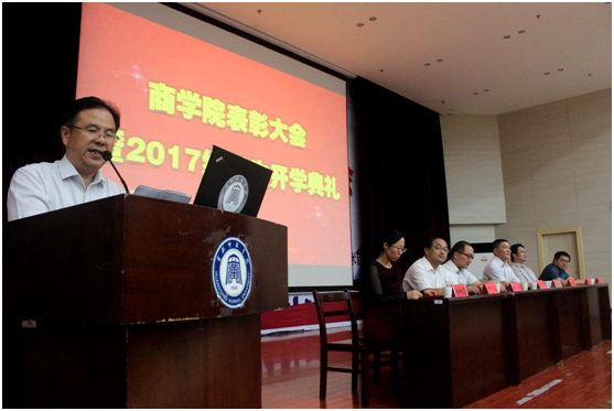 9月20日晚,我院在厚德楼学术交流中心隆重举行2017年表彰大会暨新生开学典礼。院党总支书记李月华,院长刘汉成,党总支副书记余晚霞,副院长王庆,院长助理周业旺、柯珍堂、管中柱,办公室主任李享出席会议。会议由余晚霞主持。