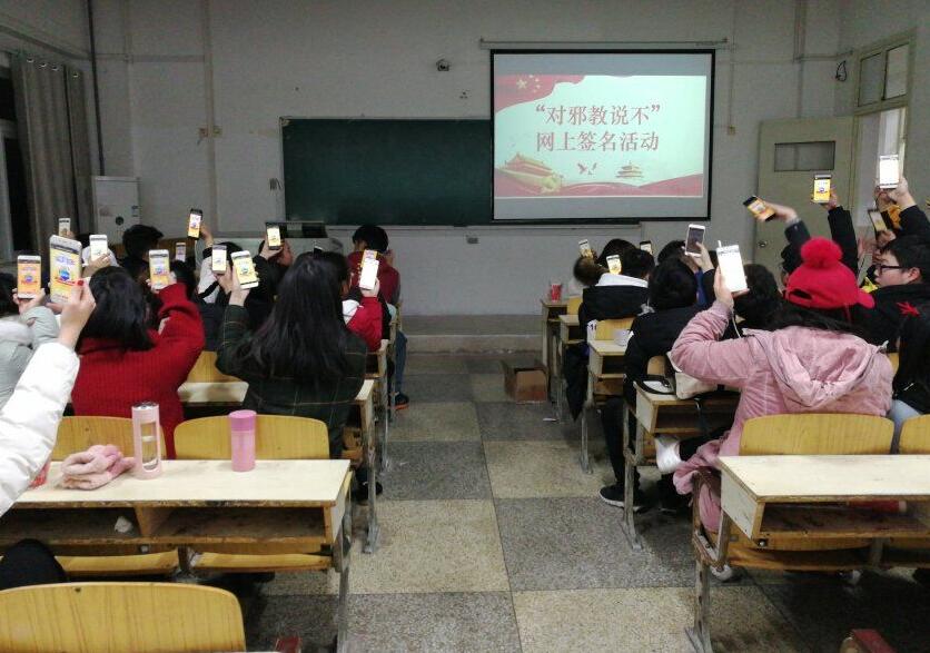 当晚,同学们在各班团支书的组织下,微信关注“中国反邪教”公众号,进行了“对邪教说不”的签名活动。此次活动同学们积极参与,活动取得了圆满成功。
