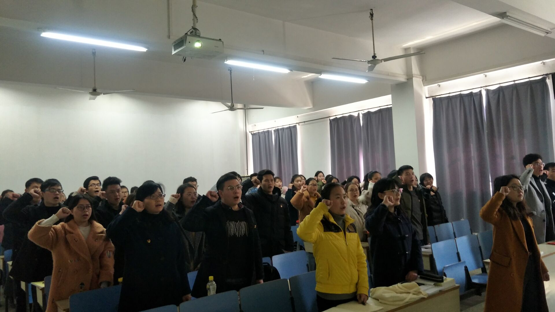 本次活动紧紧围绕主题 “学习贯彻十九大,凝气聚神谋开局”进行。首先,在认真完成“缴纳党费、奏唱国歌、重温入党誓词、诵读党章、学习系列讲话”五项规定动作后,大家共同学习了“习近平总书记在新进中央委员会的委员、候补委员和省部级主要领导干部学习贯彻习近平新时代中国特色社会主义思想和党的十九大精神研讨班上的重要讲话”、“ 习近平总书记在纪念周恩来同志诞辰120周年座谈会发表的重要讲话”、“王立兵书记在黄冈师范学院党委二届九次全会上的讲话”等材料,提炼精髓并结合自身具体情况进行讨论。学生党员们纷纷表示,一定把理论和实践联系起来,在学习和生活中起到榜样引领的作用。然后,席桢和程惠两位老师分别代表资源а√天堂中文中文在线学生第一支部和第二支部谈了2018年资源а√天堂中文中文在线学生党支部工作计划,要求学生党员们一定要团结在党支部周围,凝气聚神搞好新学期的工作。
