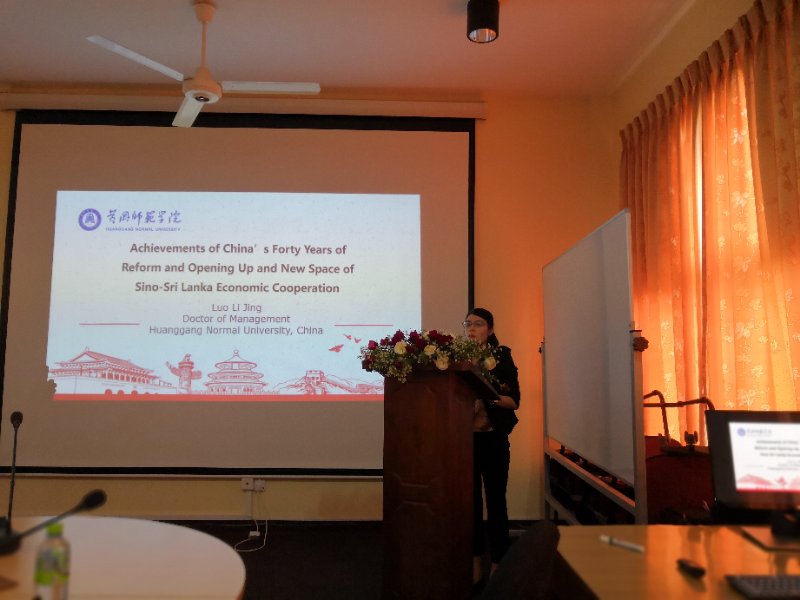 12月21日,应斯里兰卡萨伯勒格穆沃大学邀请,我校资源а√天堂中文中文在线教师骆李静在第七届斯里兰卡萨伯勒格穆沃大学经济论坛国际学术会议作了题为“中国改革开放四十年成就与中斯经济合作新空间”的主旨报告,并回答了与会者关心的问题。斯里兰卡专家学者对中国改革开放四十年成功经验充满兴趣,并就中斯开展各领域合作进行了广泛讨论与探讨。报告结束后,骆李静博士接受了斯里兰卡萨伯勒格穆沃大学颁发的证书。