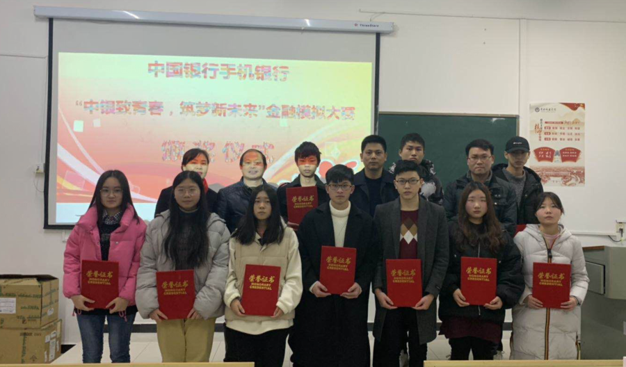 1月8日下午,中国银行黄冈分行对获奖学生进行颁奖,颁奖仪式在创新楼313隆重举行。院党总支副书记袁建明、中国银行黄冈分行行长高拥军、中国银行明珠大道支行行长宋学军、院团委书记黄杰、中国银行明珠大道支行理财经理姜瑜、产品经理向颖参加了颁奖典礼。