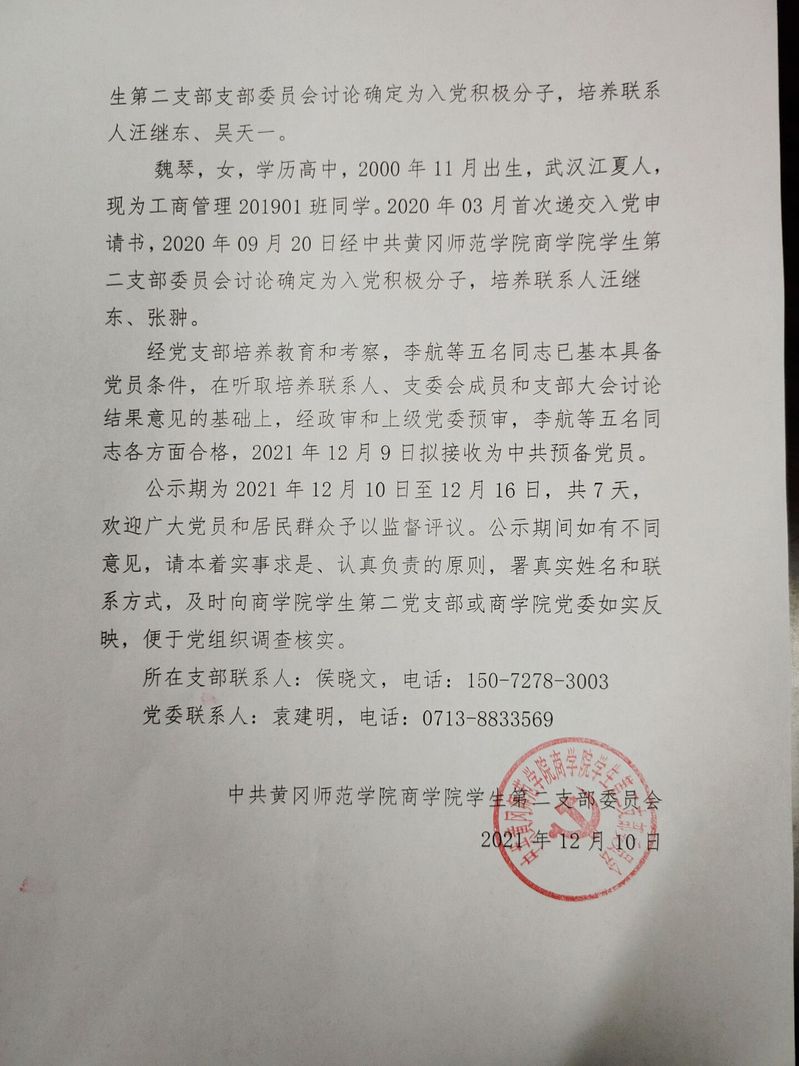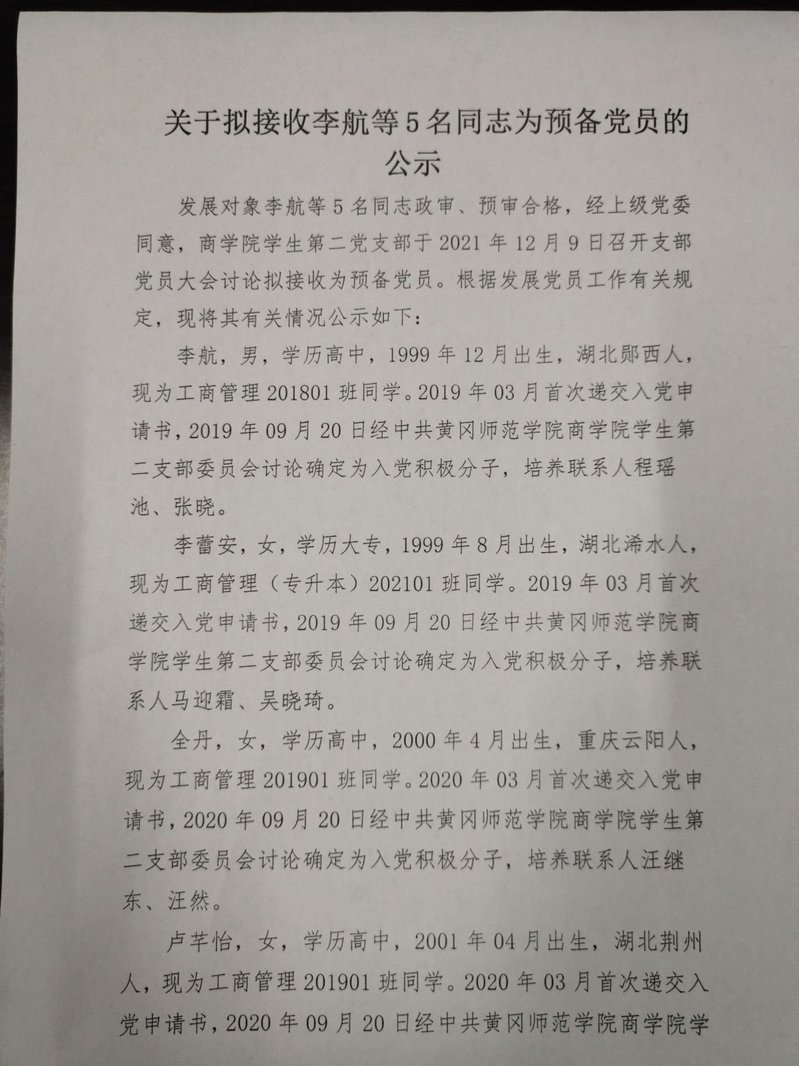 2021年下半年资源а√天堂中文中文在线学生第二党支部关于拟接收李航等5名同志为中共预备党员的公示