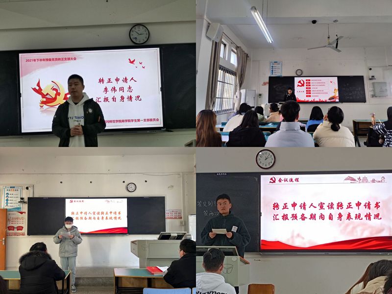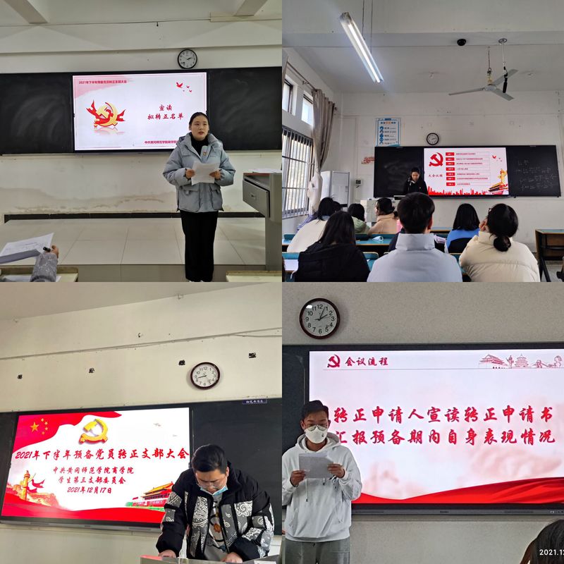 2021年12月17日下午,资源а√天堂中文中文在线学生各党支部分别于创新楼102教室、力行楼202教室、力行楼204教室、力行楼302教室召开预备党员转正支部大会。大会由学生各支部副书记主持各支部全体党员参会。