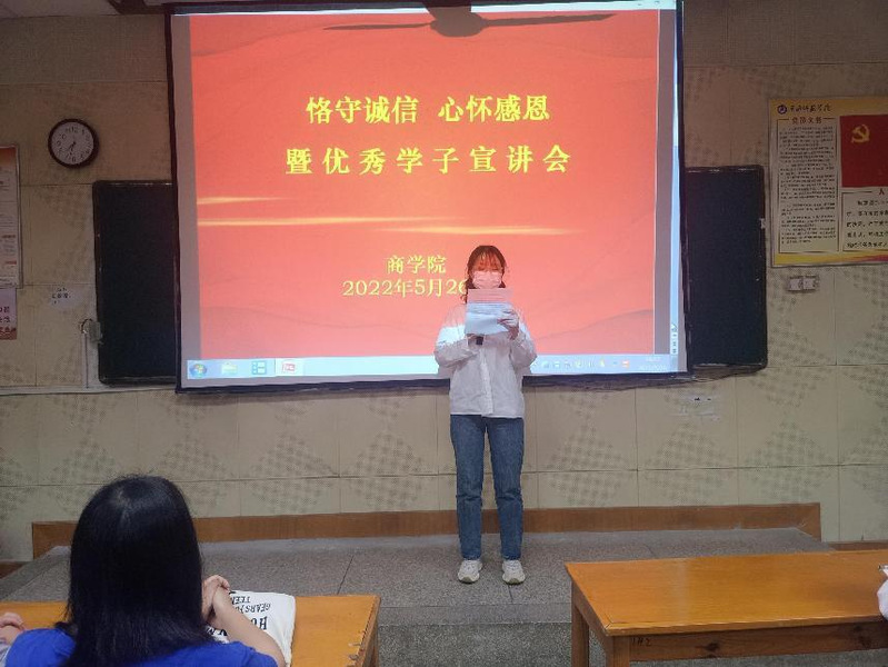 为深入贯彻党的教育方针,全面宣传党和国家各项学生资助政策和举措,落实立德树人根本任务,培养大学生诚实守信、感恩奉献、勇于担当的优秀品质,资源а√天堂中文中文在线于2022年5月26日晚上7:00—8:30在力行楼209教室开展了“恪守诚信心怀感恩”暨优秀学子宣讲会。辅导员何秀平老师、2020届和2021届受资助学生以及优秀毕业学子参加了本次活动。