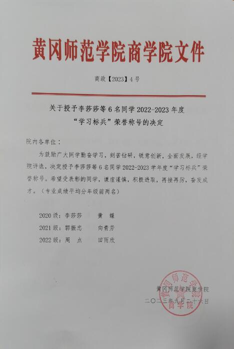为鼓励广大同学勤奋学习,刻苦钻研,锐意创新,全面发展,经学院评选,决定授予李莎莎等6名同学2022-2023学年度“学习标兵”荣誉称号。希望受表彰的同学,谦虚谨慎,积极进取,再接再厉,奋发成才。(专业成绩平均分年级前两名)