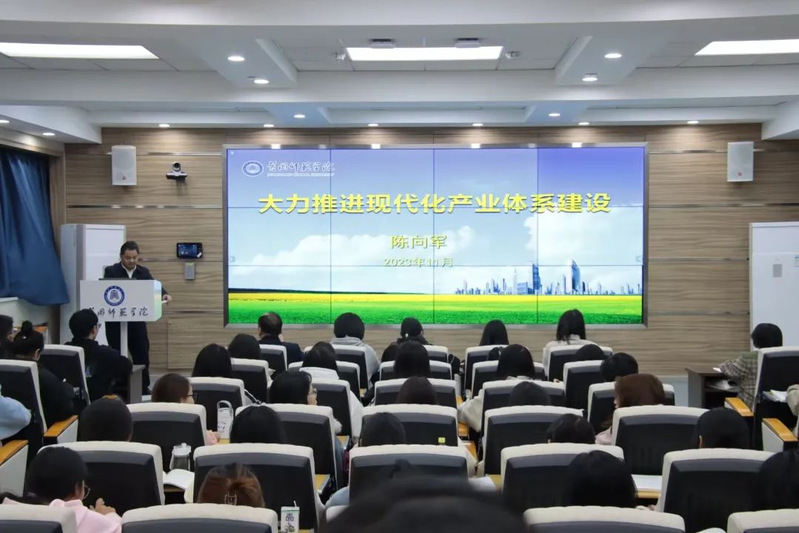 11月29日下午两点,校党委书记陈向军以《大力推进现代化产业体系建设》为题,在求实楼308教室为资源а√天堂中文中文在线工商和国贸专业2023级同学讲授思政课。