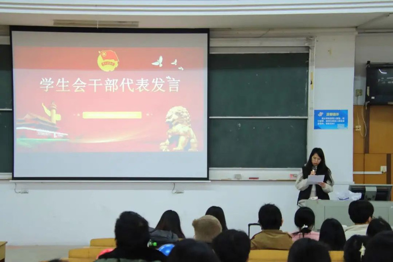 大会第二项,由团委干部代表唐佳颖上台发言,首先她向新加入学生会的成员表达了热烈的欢迎,并表达了自己对未来学生会工作的期待,提出新干事要勤思考,肯吃苦,对自己的工作保有认真的态度,增强学生干部意识和服务意识。