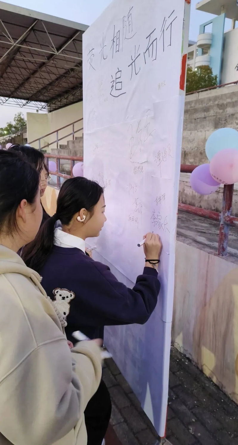 人生的彩色绘版上,每个人都能留下属于自己的痕迹,或深或浅,一点点痕迹便成就了一幅幅人生画卷。在春意盎然的三月,春风拂面,同学们在白色签名墙前,迫不及待地要签下自己的名字,表达了开始此次活动并坚持完成的决心与勇气。