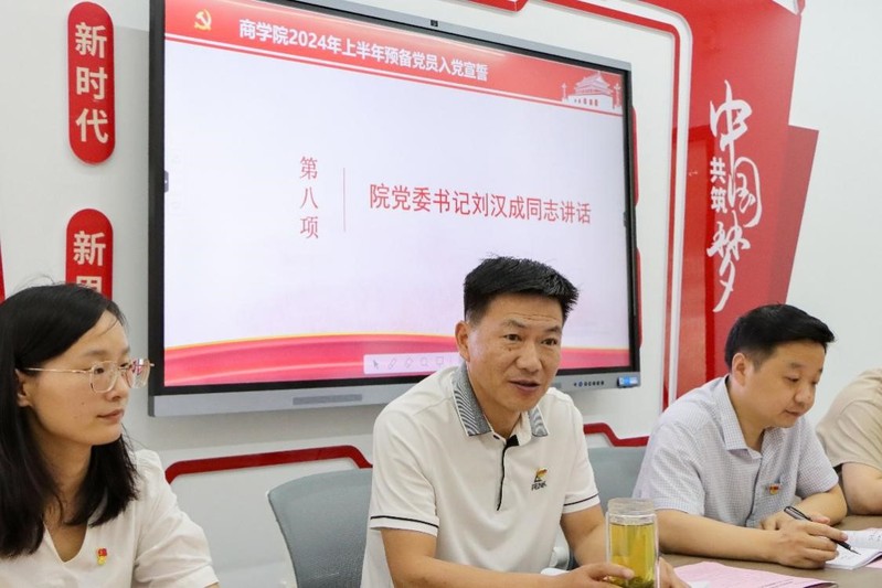 第八项,院党委书记刘汉成同志讲话。刘书记首先代表学院党委对新发展的19名预备党员表示祝贺,他指出,入党宣誓仪式是一次庄严、生动实际的党的观念的教育,党章规定预备党员必须面向党旗进行入党宣誓。他要求,大家一是牢记入党誓词。每一位同志都应当永远记住入党誓词,永远对党和人民忠诚。二是践行入党誓词。既要坚定理想信念,又要增强党性修养,更要做到知行合一。三是发挥党员先锋模范作用。同学们要在学习成绩、学科竞赛、第二课堂、学院各项活动中起到表率作用,真正做到平时能看出来,关键时刻能站出来,生死关头能豁出来。