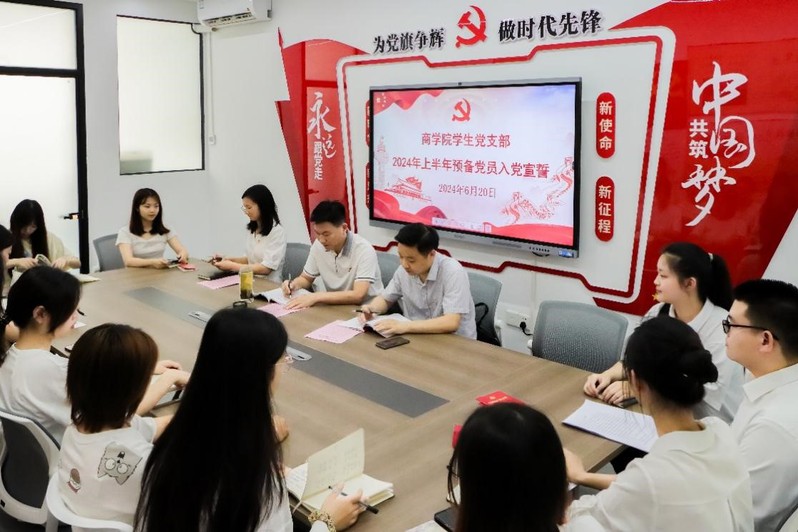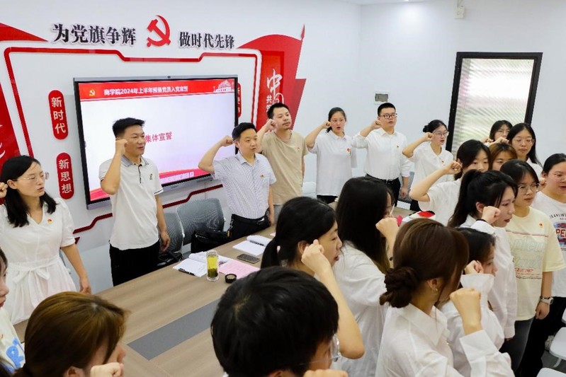 6月20日上午9:00,资源а√天堂中文中文在线2024年上半年新发展党员宣誓仪式在兰园四栋一站式服务中心103党员宣誓室庄严而隆重地举行。院党委书记刘汉成、副书记李传坤,学生党支部书记李蝶、桂海钦,正式党员但汉城和入党积极分子代表唐佳颖、聂培竹,以及19名新发展预备党员参加仪式,仪式由李蝶同志主持。