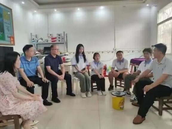 同日,刘汉成、王庆一行到达黄土岗镇桐枧冲村,与向阳花实践团队一组成员交流座谈,一组组长唐佳颖在交流座谈中分享了该组在社会实践中开展家访调研中的感悟与心得,得到了领导们的充分肯定,并希望同学们要通过社会实践提高综合素养,应发挥专业优势,服务地方,珍惜实践机会,充分展示自己,提升自己。