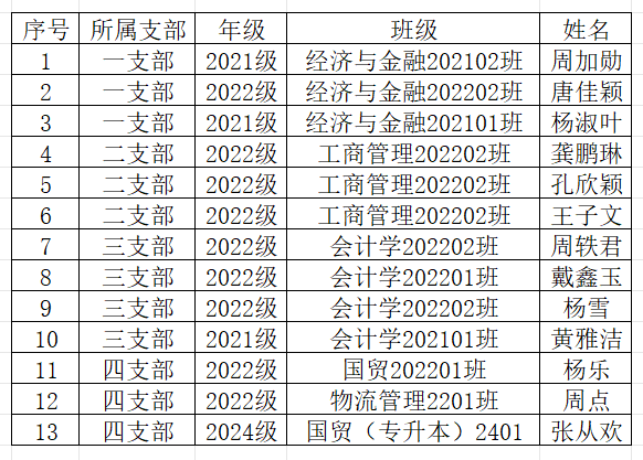 根据党中央最新修订颁布的《中国共产党发展党员工作细则》规定,经2024年10月13日党支部党员群众座谈会讨论,并经学生支部委员会讨论推荐,拟确定周加勋等13位同学为发展对象,为了进一步增强党员发展工作的透明度,加强民主监督,根据学院党委要求,现对该13位同学被确定为发展对象进行公示,广泛征求意见。