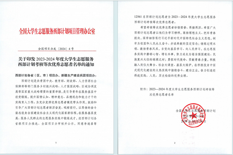 且以青春赴山海,惟以奋斗启新程。近日,全国大学生志愿者服务西部计划项目办公室发布了《关于印发2023—2024年度大学生志愿者服务西部计划考核等次优秀志愿者名单的通知》。我院张咪、张滢滢、丁佳微、尹棚、何沛佩5名毕业生作为西部计划志愿者获评该年度“全国大学生志愿服务西部计划优秀志愿者”称号。